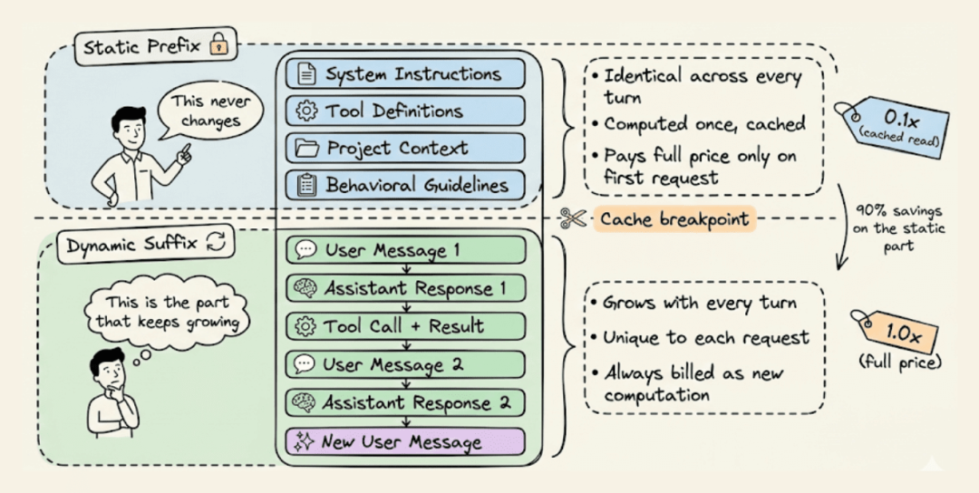- • 静态前缀:跨轮保持相同的部分:系统指令、工具定义、项目上下文和行为准则。