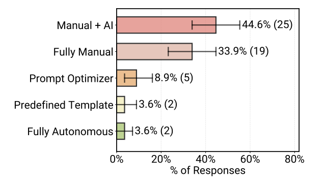 78%的系统采用全手动或手动+AI 辅助的方式构建 Prompt 生产环境的。Prompt 可能会非常长,12%的Prompt超过了10,000个Token。