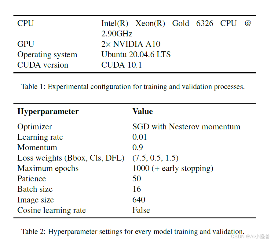 表 1 显示了本地服务器的硬件和软件规格,表 2 显示了下面分析的所有模型训练的超参数配置。正如我们在第 3 节中提到的,以下结果的分析主要以 mAP50 作为我们的主要指标,因为它能很好地指示检测效果,特别是对于难以检测的棉铃。mAP50-95 是我们的第二个模型性能指标,提供关于简单检测执行情况的信息。