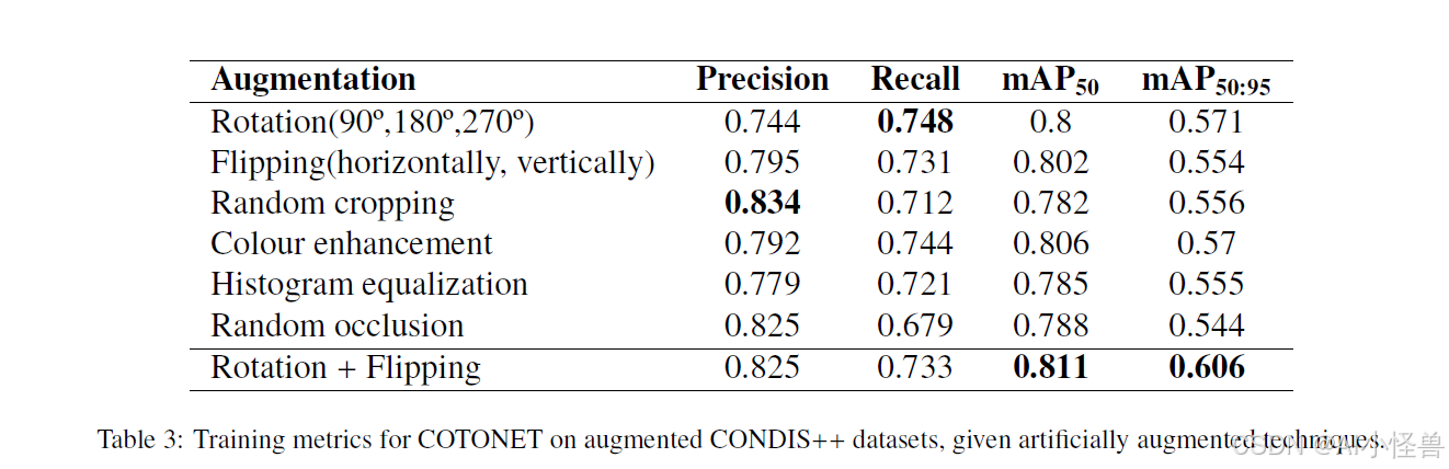 使用 COTONET,我们将数据增强单独应用于 CONDIS++,并使用我们认为可以很好协同工作的技术子集。表 3 显示了 COTONET 在使用 CONDIS++ 增强变体时的训练结果。指标显示数据增强技术对模型在棉花数据集上的性能有明显影响。简单的几何变换表现出互补的行为:旋转获得了最高的召回率,表明对正实例的检测更好,而翻转有利于精确率,反映了两个指标之间的折衷。