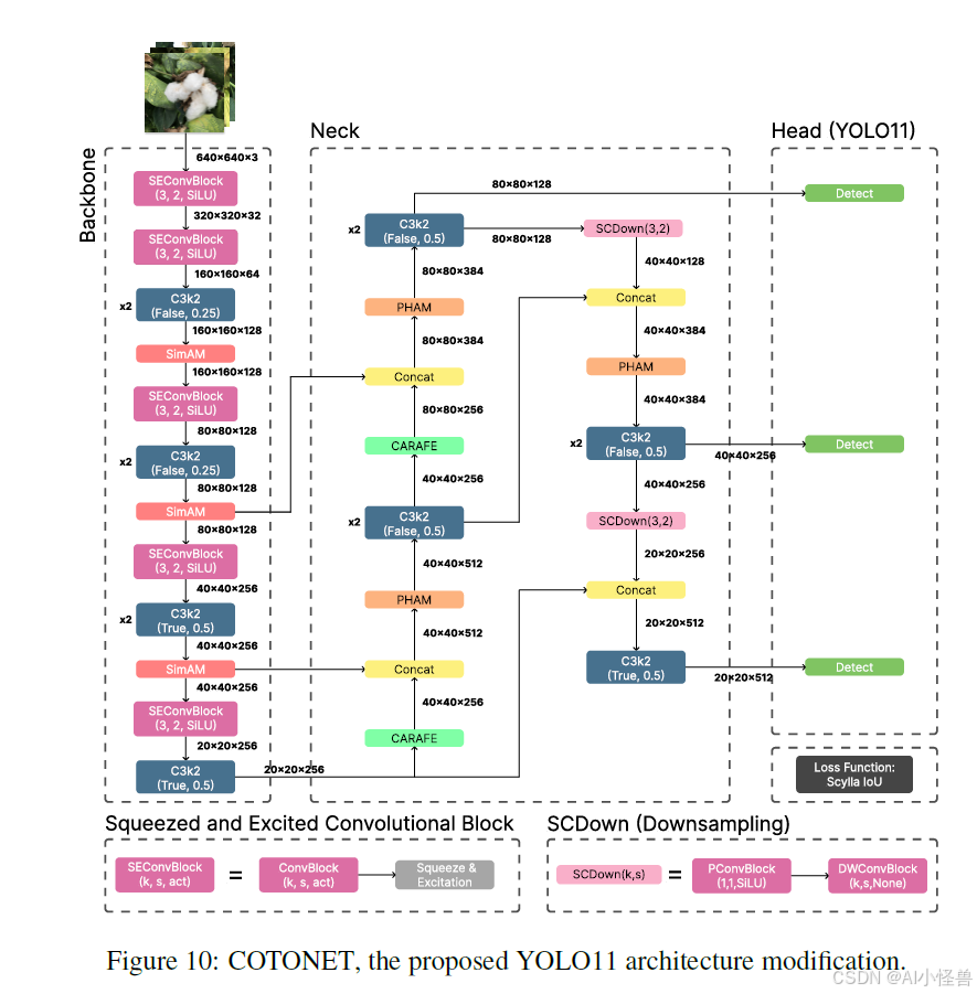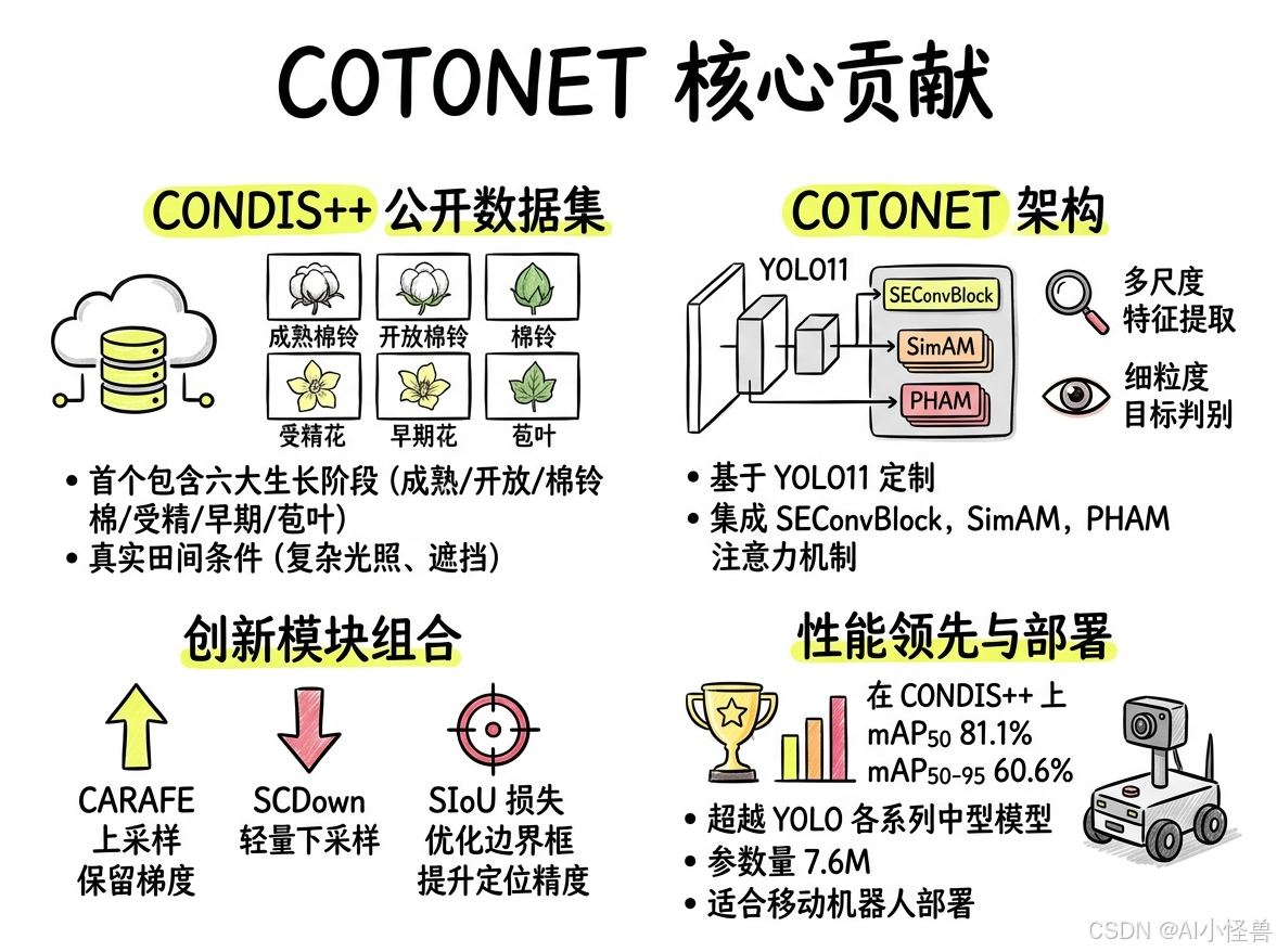 提出COTONET架构:基于YOLO11定制,集成SEConvBlock、SimAM与PHAM注意力机制,增强多尺度特征提取与细粒度目标判别。