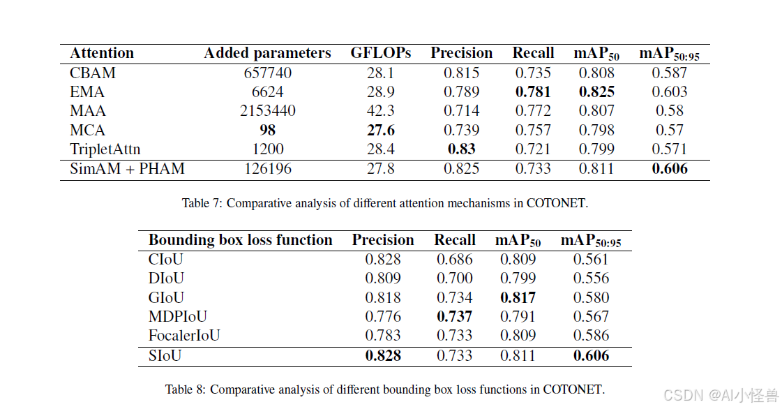 表 8 显示了使用 CONDIS++ 和不同边界框损失函数训练的 COTONET 的指标。经典公式表现出有竞争力的精度值,但在召回率和 mAP50-95 指标上显示出局限性,表明在高 IoU 值下缺乏鲁棒性。GIoU 在精确率和召回率之间提供了更好的平衡,获得了更高的 mAP50 值,但同样,在高 IoU 阈值下缺乏准确性。对于 MDPIoU 和 FocalerIoU,召回率优先,但未能在 mAP 上实现一致的改进。这些结论表明,正面检测的增加并不总能转化为更好的空间精度。