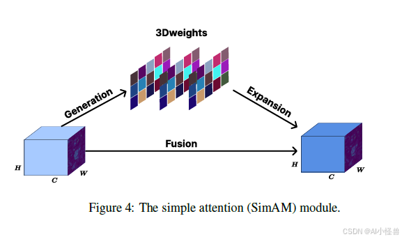 简单注意力模块:SimAM 是一个简单而有效的注意力机制,它专注于 3D 注意力,且不向网络添加参数。这个无参数注意力模块为每个神经元分配 3D 权重,并通过受空间抑制启发的能量函数计算每个神经元的相关性。SimAM 建立了一个能量优化问题,其中目标神经元 t 必须是可区分的,而周围的神经元被抑制,基于以下能量函数测量一个神经元与其他神经元之间的线性可分性,从而获得 w_t、b_t 的快速闭式解。假设单个通道中的所有像素遵循相同的分布,我们得到神经元 t 的较低能量 e^*_t。每个神经元的重要性被计算为 1/e^*_t,因此输出特征图应用为 X * 1/E。