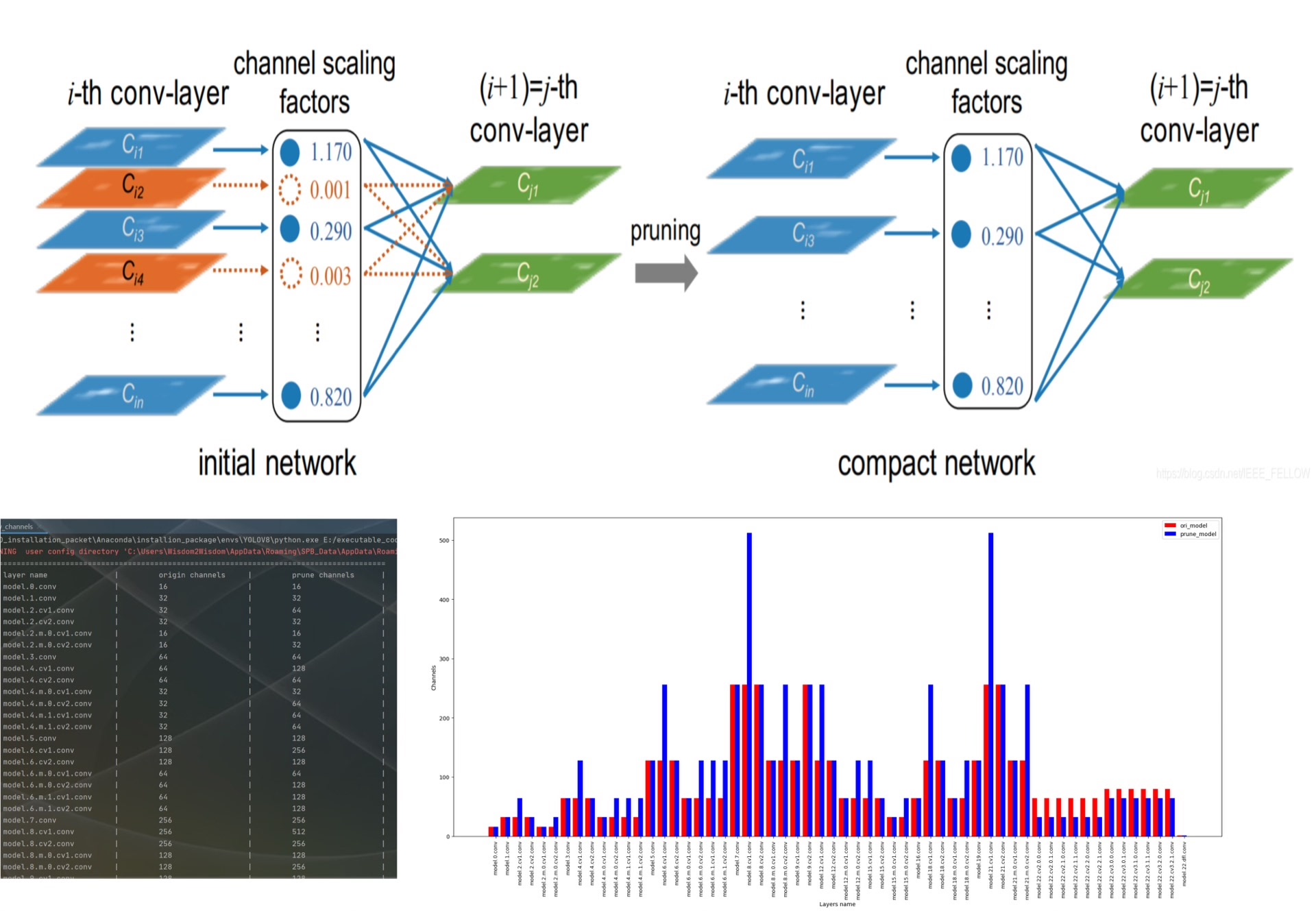 YOLOv8剪枝代码方法(一) 该剪枝代码是基于L1、L2、RandomStrategy进行剪枝 过程如下: pip install torch_pruning == 0.2.7 剪枝过程如下: ①yolov8-train.py进行训练模型权重,此时fintune = False ②yolov8_pruning.py剪枝yolov8-train.py训练的模型权重 ③yolov8-train.py再次训练模型权重,此时fintune = True,微调模型参数(需注意权重需要在GPU上) ④draw_channels.py绘制剪枝前后通道对比 至此,剪枝完成