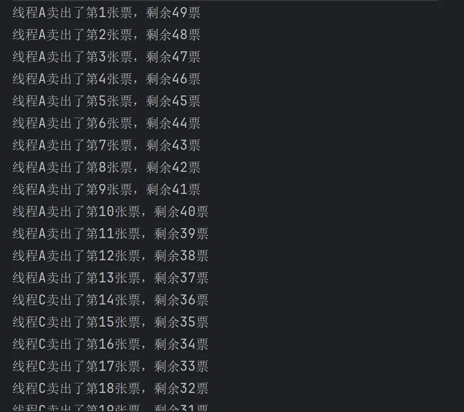 new Thread(() -> { for (int i = 0; i < 60; i++) ticket.sale();},"C").start();