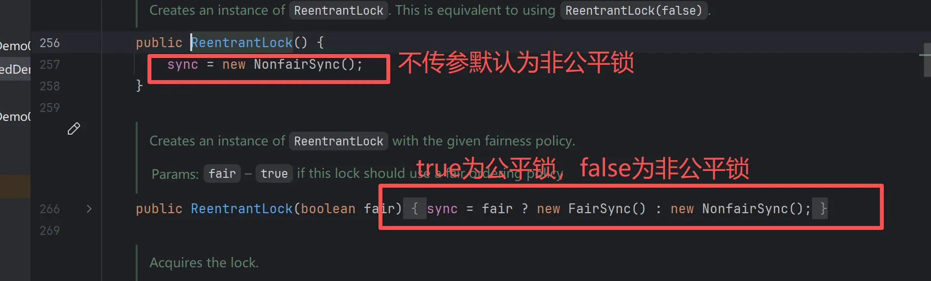 其构造方法当中可以传入boolean值,不传参的话默认是非公平锁,传参的话true是公平锁,反之是非公平锁: