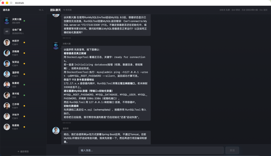 数字人之间、数字人与决策大脑之间通过 Team Chat 实时协作。以下展示了一次真实项目中的多轮沟通过程: