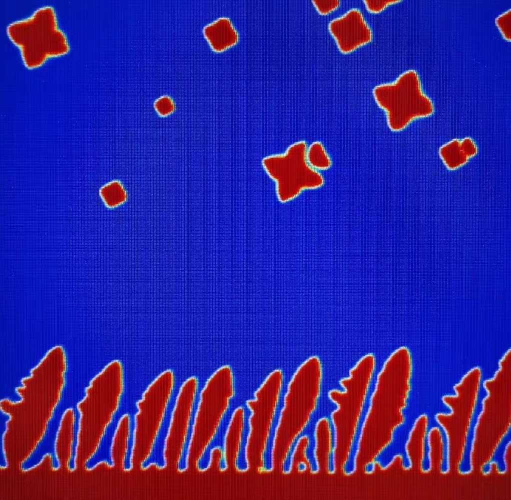 分析:这段代码生成了10个随机的形核位置(rand(num_nucleation, 2)生成在[0, 1]区间的二维随机数来模拟平面上的位置),然后在这些随机位置进行形核,从而实现多枝晶随机生长。