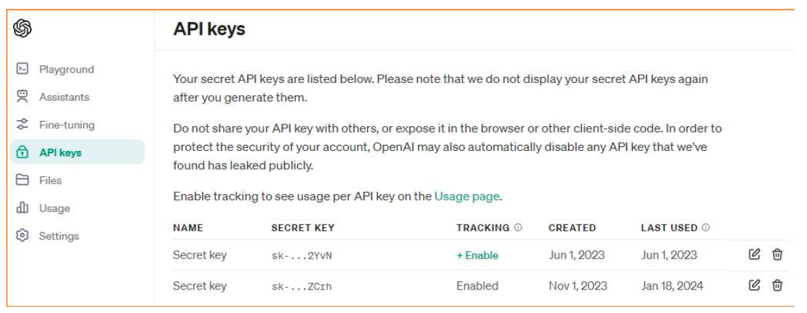 在OpenAI官网注册账号,进入API Keys页面,创建一个新的Secret Key(见下图)。注意:密钥只显示一次,务必保存好,不要暴露在浏览器或客户端代码中。