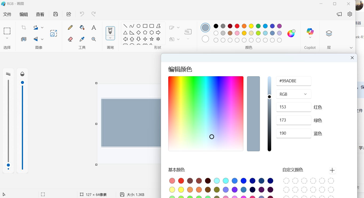 #99ADBE就是选取的颜色RGB值,已经成功获取到了,这是16进制的值,可以转换,前面省略了透明度