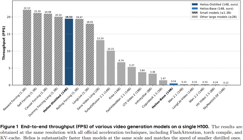 实时性能:在单个 NVIDIA H100 GPU 上,Helios 实现了 19.5 FPS 的实时视频生成速度,甚至比一些 1.3B 模型更快。