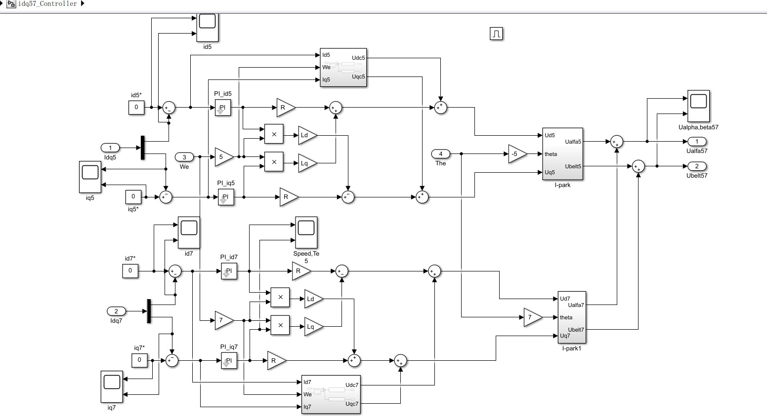 控制的核心目标是抑制电机电流中较大的5、7次谐波分量。具体怎么做呢?实时提取谐波电流,然后注入谐波电压来补偿抵消电机运行时电流中的谐波,通过抑制5、7、次谐波电流,进而抑制电机电磁转矩脉动和转速波动。