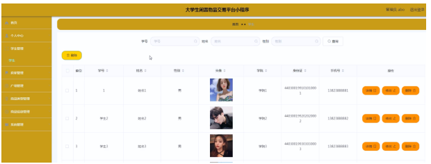 微信小程序大学生闲置物品交易平台的系统管理员可以对学生信息修改删除以及查询操作。具体界面的展示如图5.1所示。