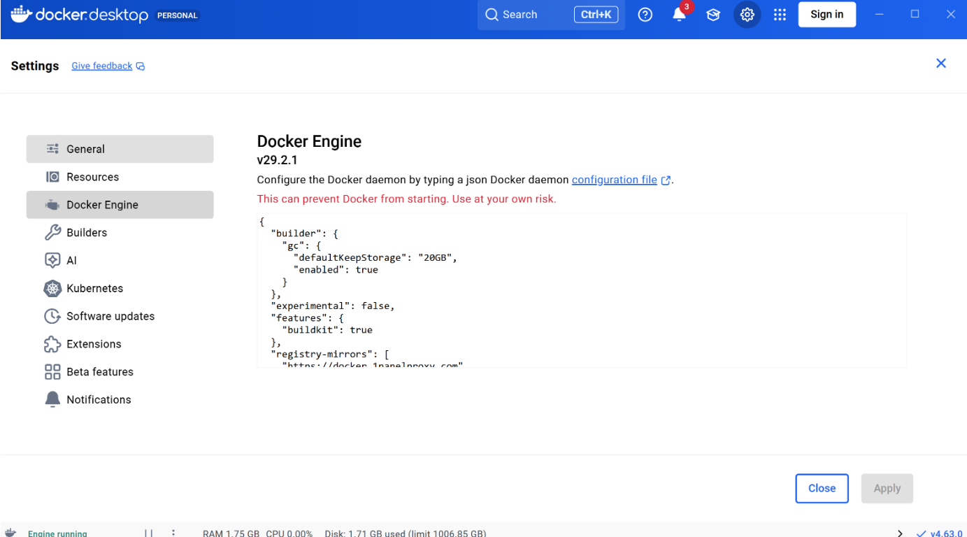 { "builder": { "gc": { "defaultKeepStorage": "20GB", "enabled": true } }, "experimental": false, "features": { "buildkit": true }, "registry-mirrors": [ "https://docker.1panelproxy.com", "https://2a6bf1988cb6428c877f723ec7530dbc.mirror.swr.myhuaweicloud.com", "https://docker.m.daocloud.io", "https://hub-mirror.c.163.com", "https://mirror.baidubce.com", "https://your_preferred_mirror", "https://dockerhub.icu", "https://docker.registry.cyou", "https://docker-cf.registry.cyou", "https://dockercf.jsdelivr.fyi", "https://docker.jsdelivr.fyi", "https://dockertest.jsdelivr.fyi", "https://mirror.aliyuncs.com", "https://dockerproxy.com", "https://mirror.baidubce.com", "https://docker.m.daocloud.io", "https://docker.nju.edu.cn", "https://docker.mirrors.sjtug.sjtu.edu.cn", "https://docker.mirrors.ustc.edu.cn", "https://mirror.iscas.ac.cn", "https://docker.rainbond.cc" ] }