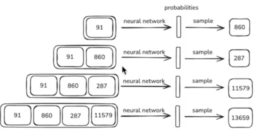 1、每一次预测,都根据上文输入的全部内容,只输出一个下文“token”