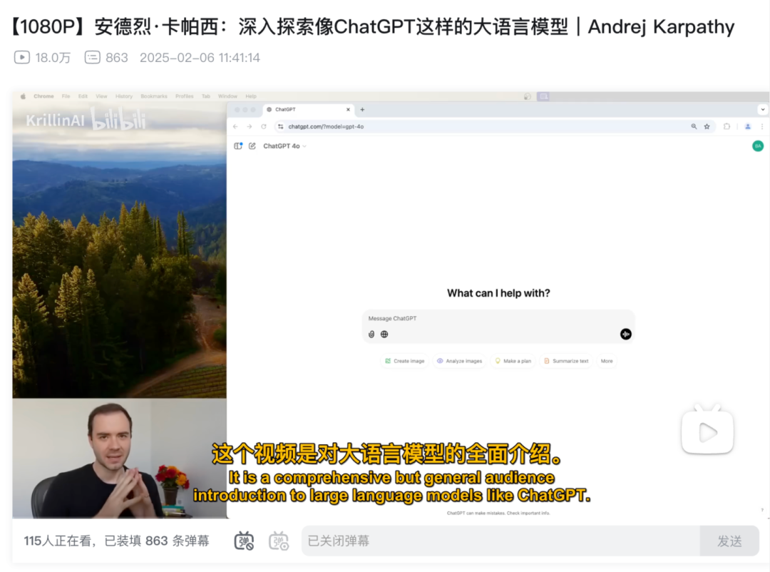 大家可以前往 B 站搜索“安德烈·卡帕西:深入探索像ChatGPT这样的大语言模型”,即可观看,全文都有字幕,不用担心听不懂。