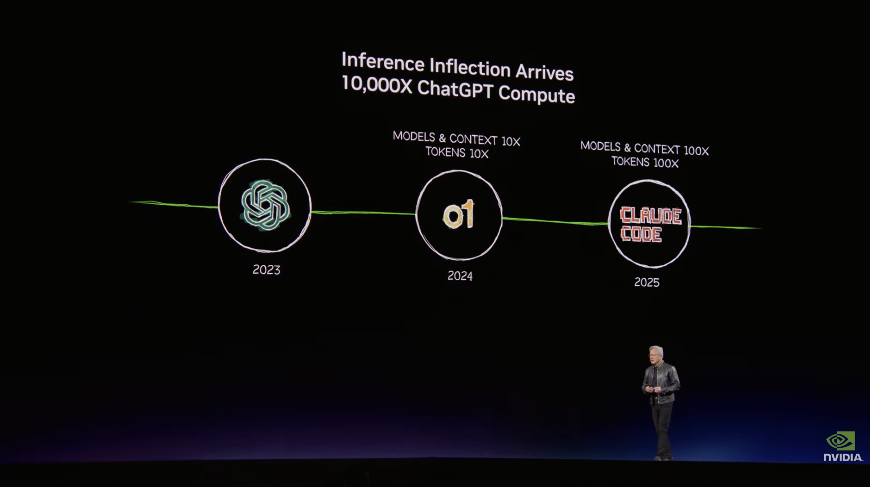 黄仁勋宣称,从 ChatGPT 的“生成”到 o1 的“推理”,再到 Claude Code 开启的“代理(Agentic)”时代,计算需求增长了 100 万倍。