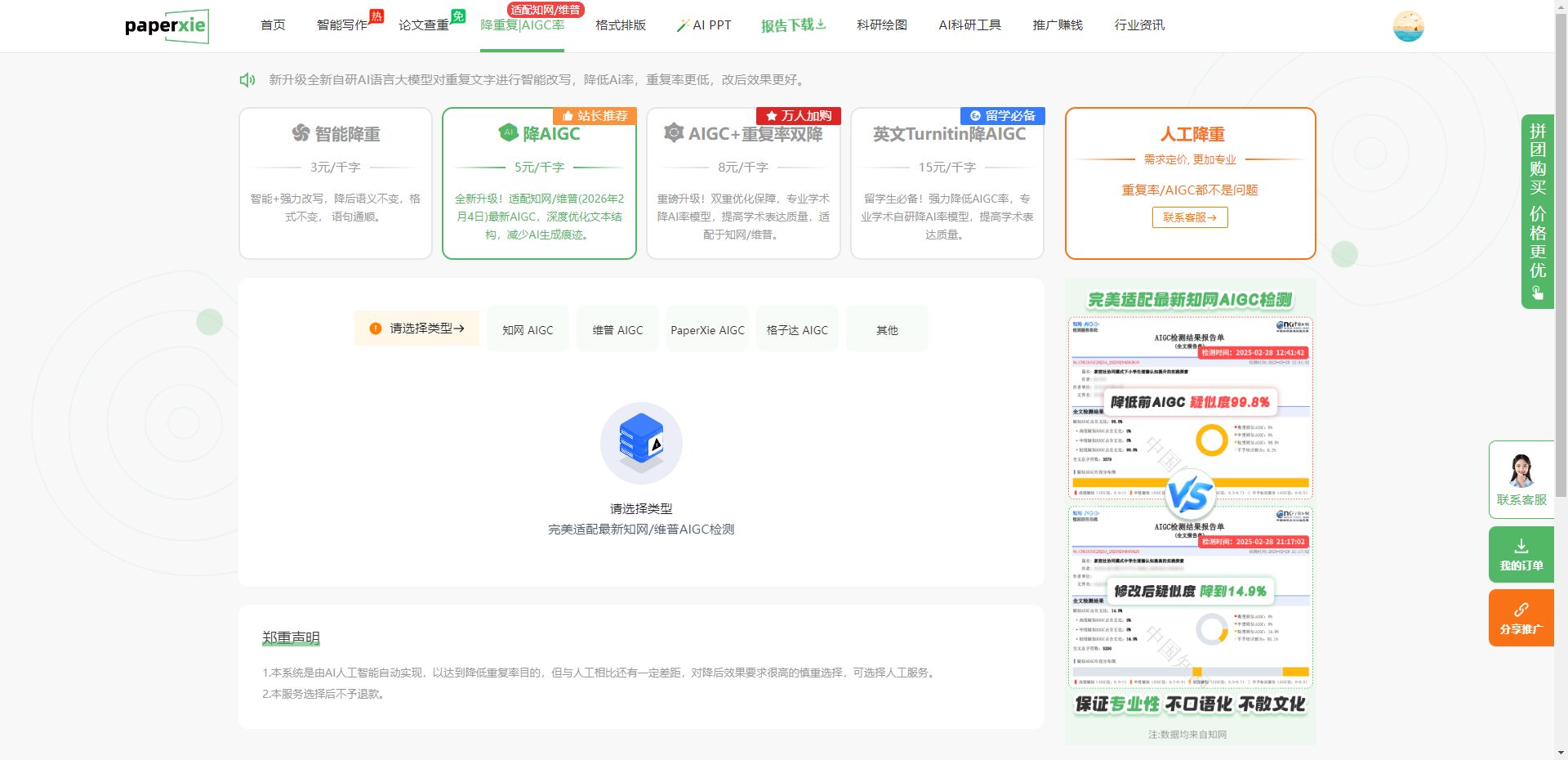 打开 PaperXie 降重功能页面,核心设计围绕 “检测类型专属适配 + 需求分层服务” 展开,完美贴合不同毕业生的痛点: