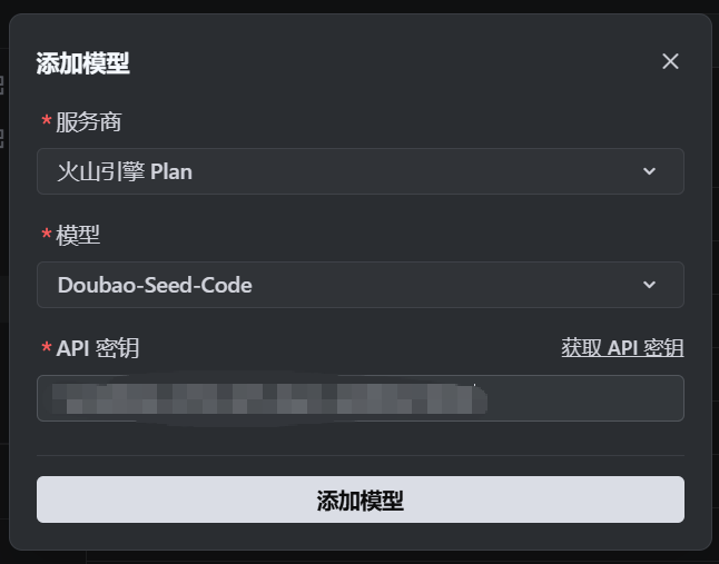 | Model Name | 支持的模型名称如下: doubao-seed-2.0-code doubao-seed-2.0-pro doubao-seed-2.0-lite doubao-seed-code minimax-m2.5 glm-4.7 deepseek-v3.2 kimi-k2.5 ark-code-latest (选择 ark-code-latest 时,可通过 开通管理页面选择或切换目标模型,切换模型后 3-5 分钟即可生效) |