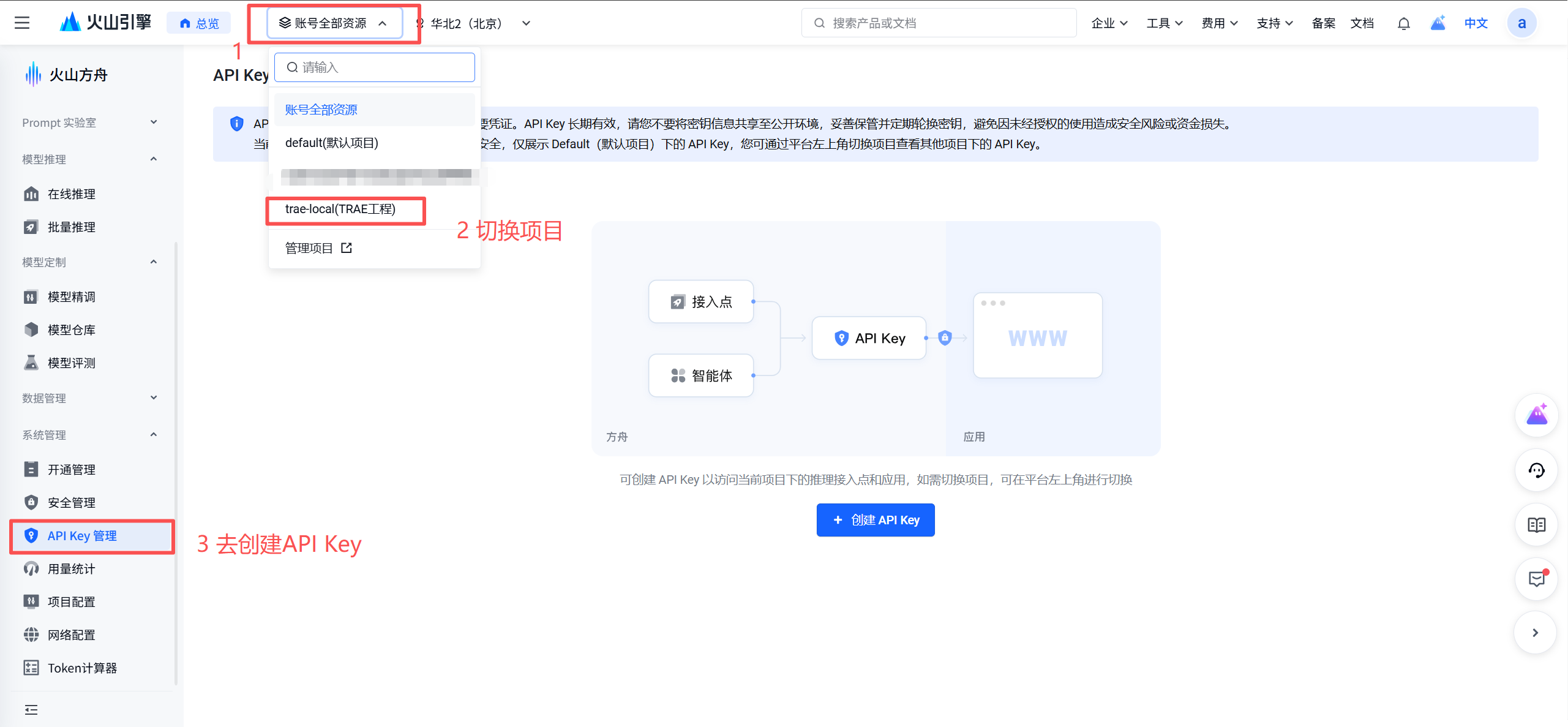推荐方式:先建项目再创建API Key,方便统计token使用情况