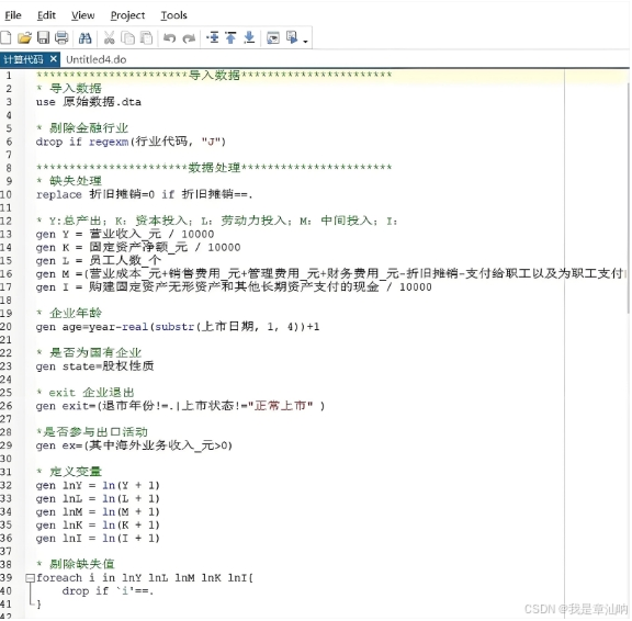 这是最基础的方法,直接用OLS回归估计生产函数,然后计算全要素生产率。 Stata代码: