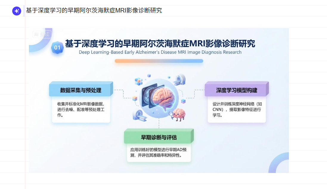 AIPPT的核心价值在于将“内容构思”到“演示框架”的生成过程智能化。你根本无需从空白幻灯片开始手动创建每一页的结构和标题。只需要输入研究主题、论文摘要、或一个分点的大纲,AI引擎会基于对学术写作规范的理解,自动生成一个包含封面、目录、章节过渡页、内容页(通常已预设图文占位结构)和致谢页的完整演示文稿草稿。例如,输入“基于深度学习的早期阿尔茨海默症MRI影像诊断研究”及几个核心论点,AIPPT可能在几分钟内产出一个包含“研究背景与意义”、“相关技术与理论”、“数据与方法”、“实验结果与分析”、“结论与展望”等逻辑章节的PPT初稿,并配以初步的版式设计。这解决了用户最大的初始障碍——面对空白画布不知如何搭建符合学术规范的展示框架。它不仅节省了大量时间,更重要的是,提供了一个结构化的思考引导,帮助用户检视和梳理自己的讲述逻辑。