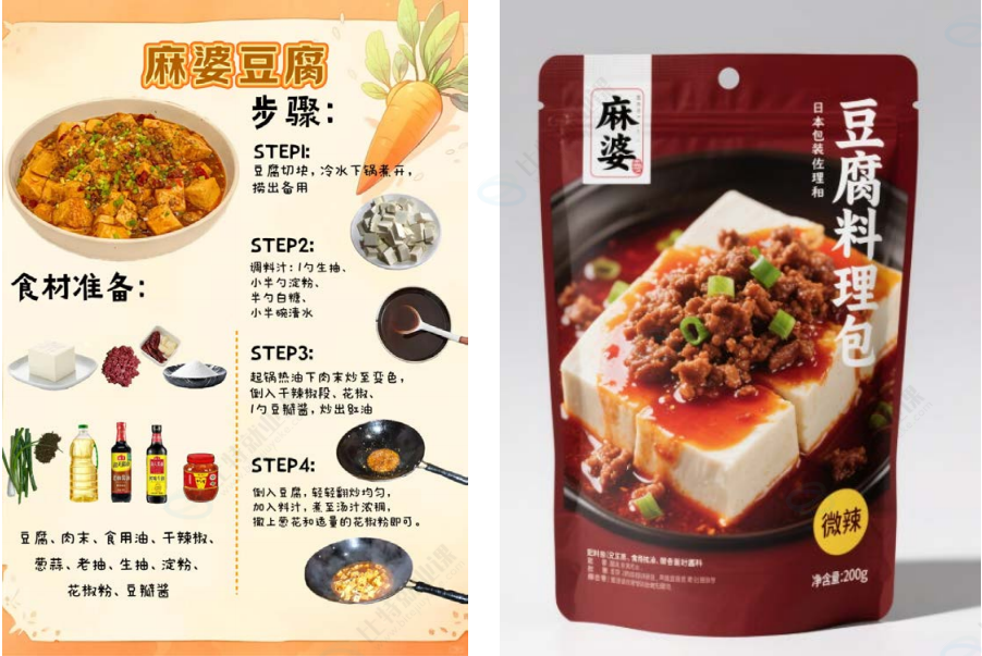简单的说明书:1. 热锅放油,2. 倒入酱料包炒香,3. 加入豆腐和少量水煮 5 分钟。