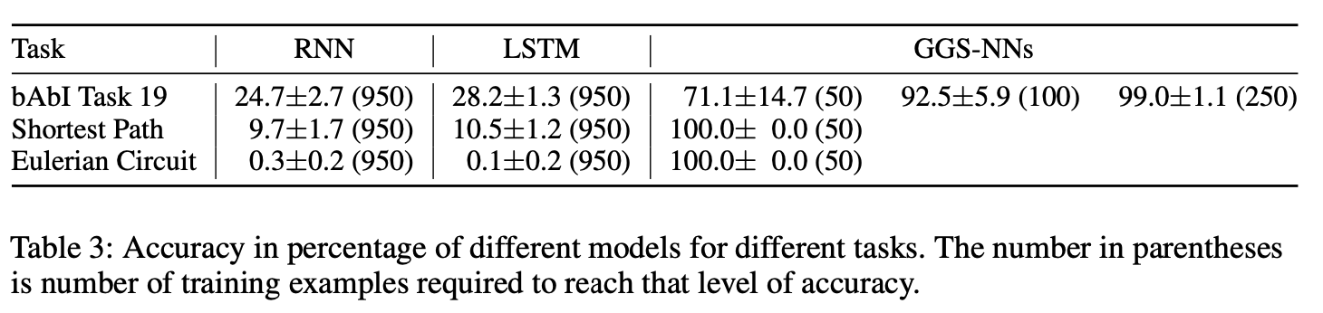 表3展示了该任务的结果。RNN和LSTM在此任务上均表现失败。然而,仅使用50个训练样本的GGS-NN在测试准确率上显著优于RNN和LSTM。
