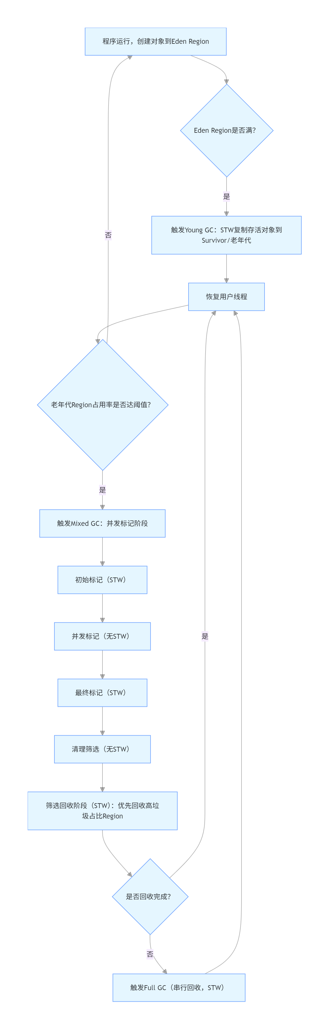 - 回收类型:常规回收为 Young GC(仅年轻代,STW)和 Mixed GC(年轻代 + 部分老年代,低 STW),Full GC 为异常情况需避免;