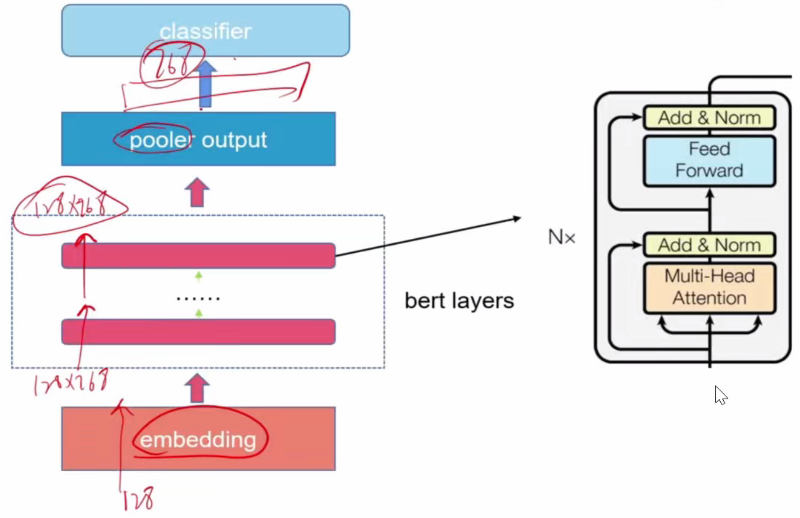 ①词embedding:21128个文字编码长度由one-hot得来,再Linear(21128,768)