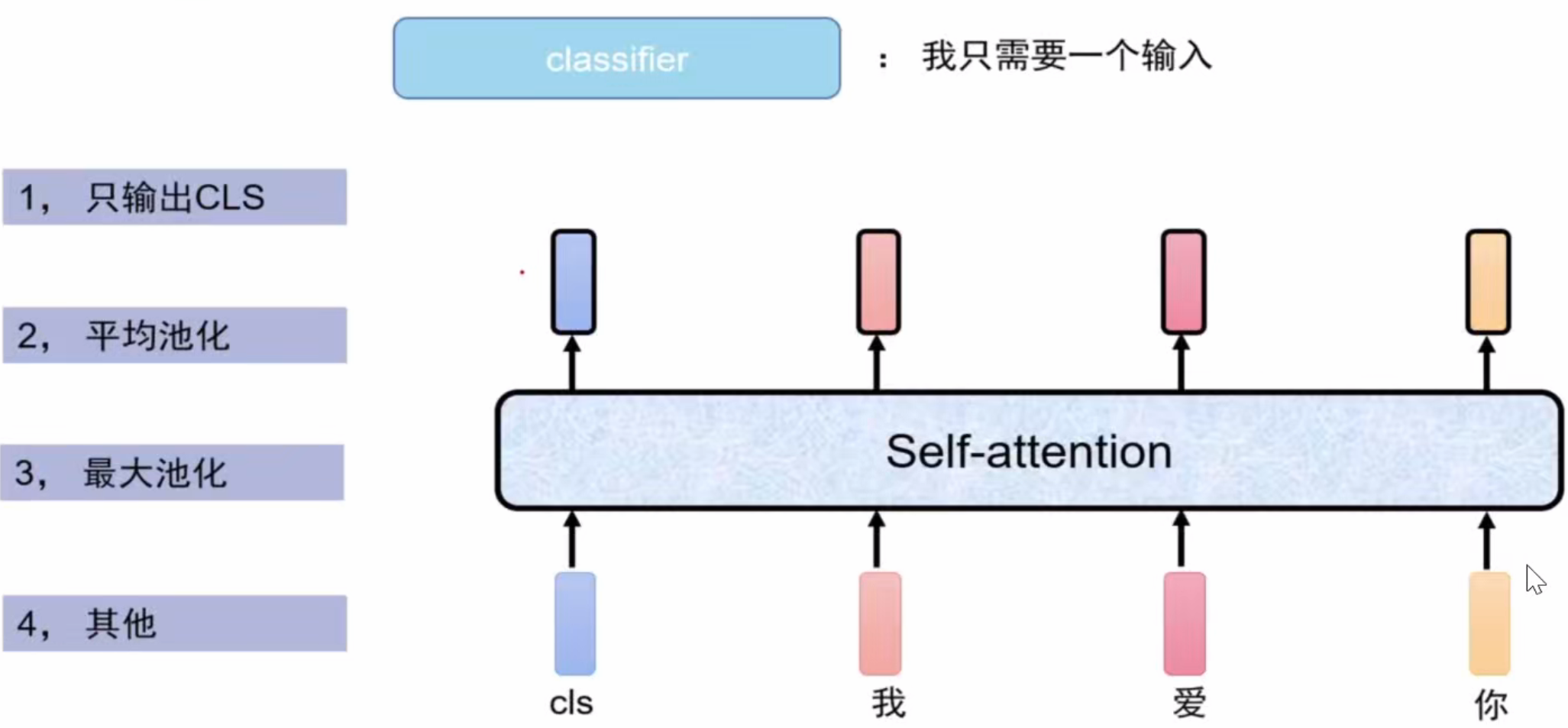self-attention机制给了4*768的输出,但是分类器classifier只要1*768方便进行n类的分类linear(768,n),于是有上图4种降维方式,最常见的是只输出CLS。
