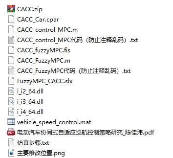 CACC 协同式自适应巡航模型(仿真软件版本:Carsim2016,Matlab2018b及以上) 搭建四辆车在carsim和simulink进行协同式自适应巡航,其中间距策略考虑领航车速的影响,各个车辆采用分层式控制,分层式控制器主要分为下层控制(使用车辆逆纵向动力学模型(包括逆发动机模型 ))和上层控制(模糊MPC算法对相对距离,相对速度,加速度等进行调节,其中模糊逻辑对MPC的权重系数进行在线调整,stateflow进行模式切换),实现定速巡航和车队跟随工况。 附带详细学习资料,适合入门自适应巡航,协同式自适应巡航,自动驾驶纵向控制,同时学习模型预测控制算法和模糊推理方法。