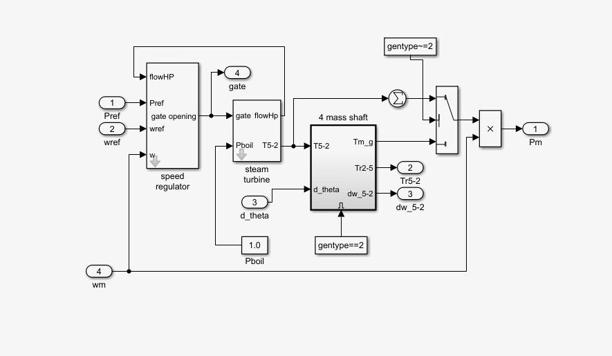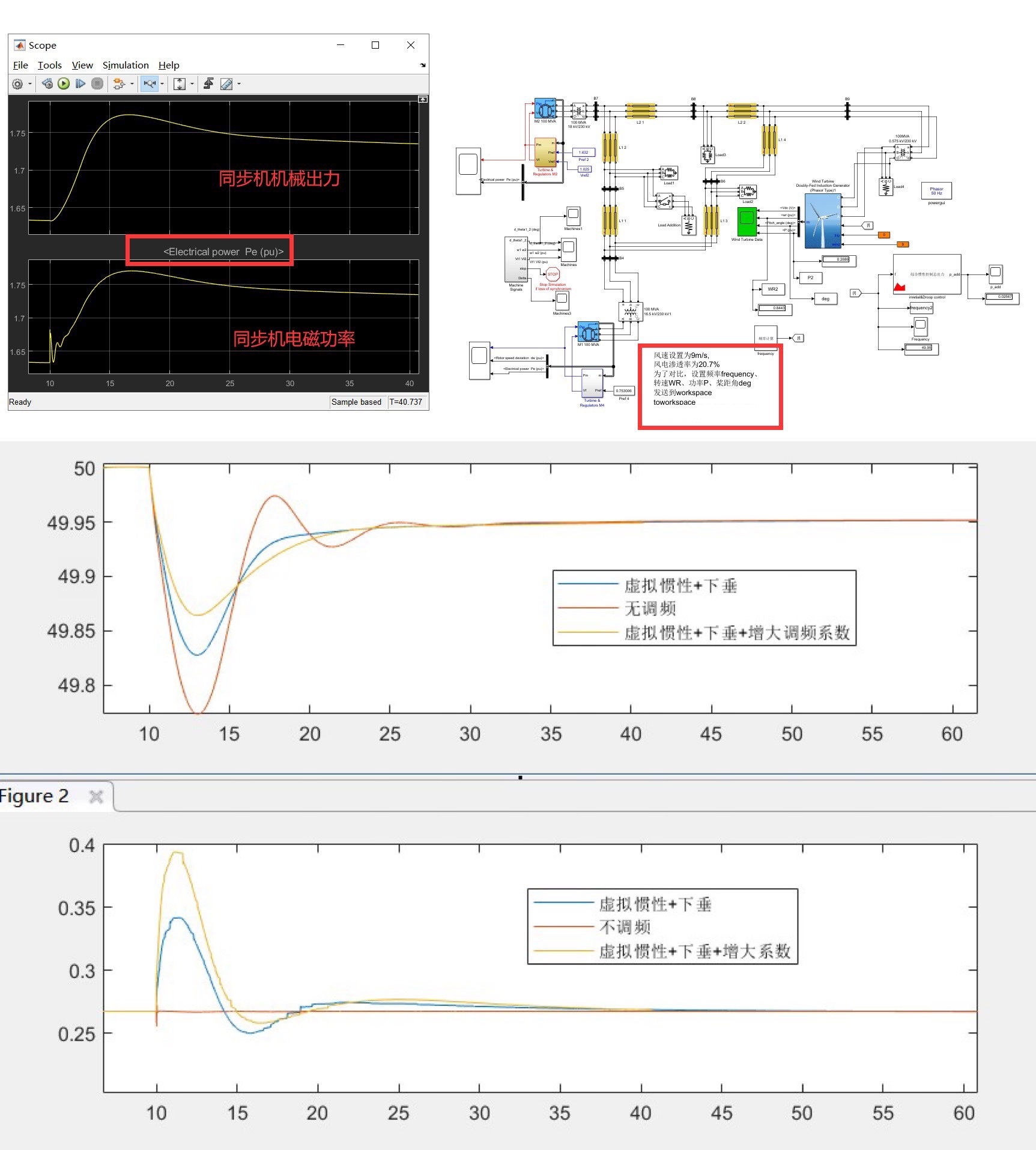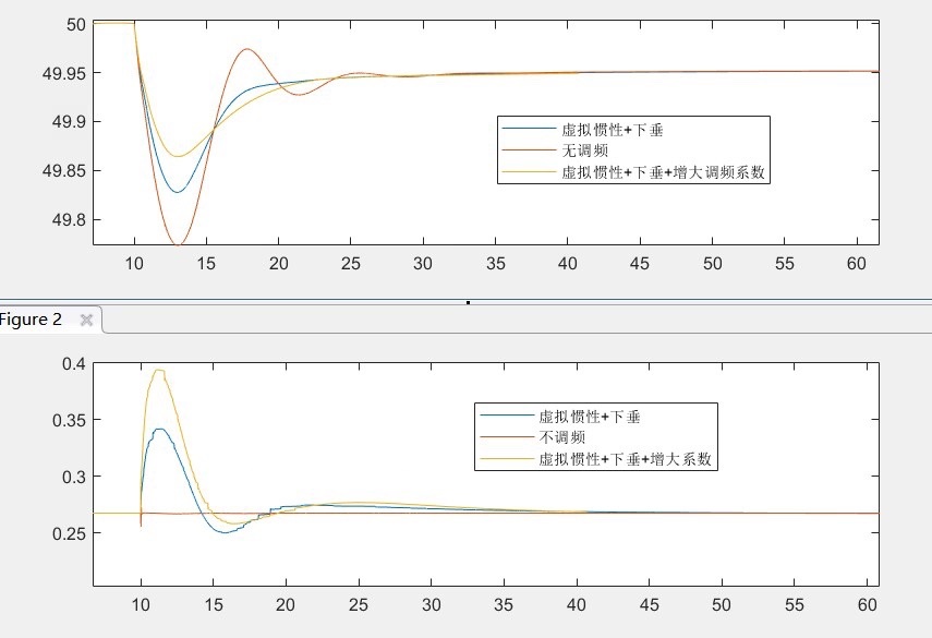 此模型不仅可以研究风电调频,还能探索风火联合、火电调频等多种场景。在风火联合调频中,风电与火电需要协调配合。火电通过调速器响应频率变化,而风电通过下垂控制和虚拟惯性控制辅助调频。