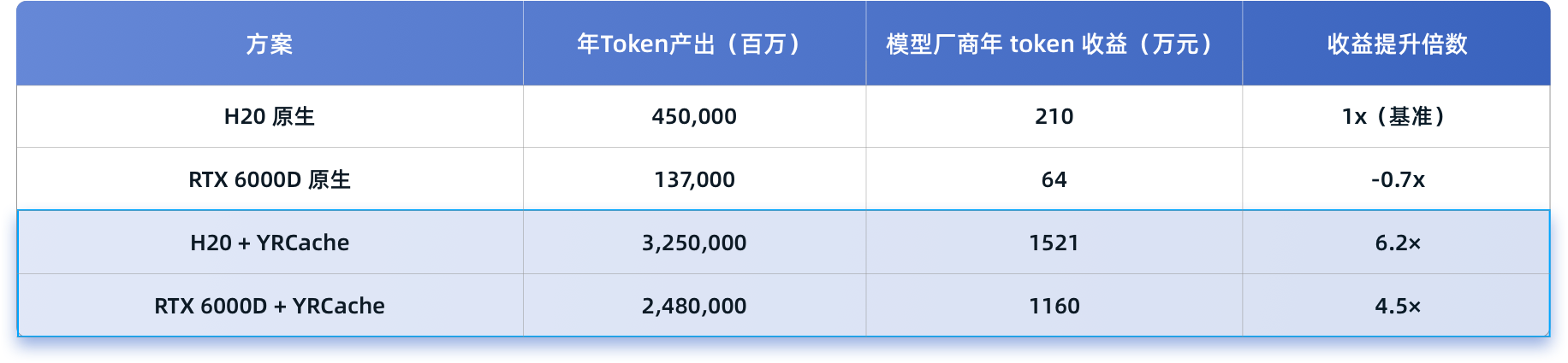 与此同时,RTX 6000D 的收益能力也进入了高端卡区间,但其硬件成本只有高端卡的一半。这一对比充分证明,YRCache 是推理基础设施“以存代算”的优选解,助力企业实现“低成本、高产出”。