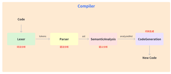 4. 代码⽣成(Code Generation):基于AST⽣成⽬标代码,包括优化代码结构、⽣成代码