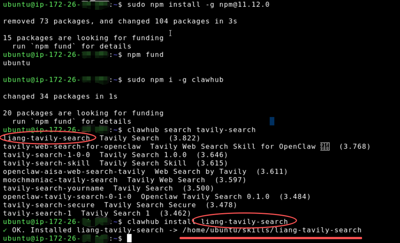 注意: 这里有个坑,ClawHub 下载的目录名通常带作者前缀(如 liang-tavily-search),但搬家到 OpenClaw 内部时,文件夹名必须改为该 Skill 的 Slug 名(即 tavily-search),否则系统认不出来 。见上图