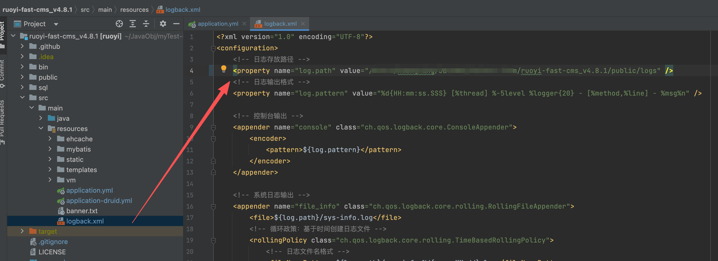 在/RuoYi-fast-cms/src/main/resources/logback.xml中设置日志存储位置。