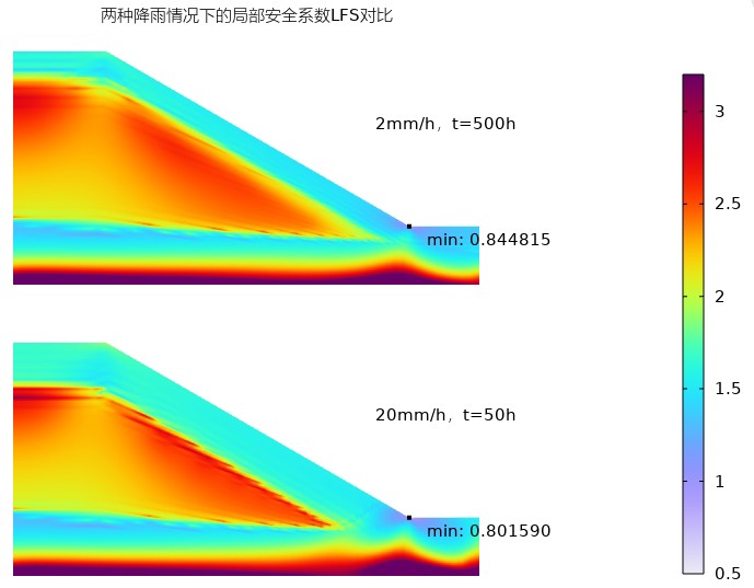 可视化结果惊现"安全系数等高线",在裂隙网络交汇处出现多个<1的危险区,像奶茶杯底没化开的珍珠。对比不同雨强,20mm/h工况下危险区体积暴涨3倍,妥妥的暴雨刺客。