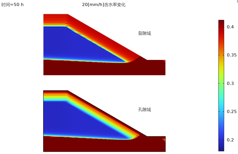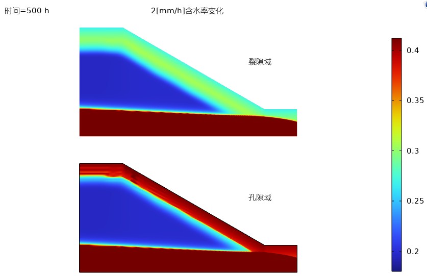 边坡局部安全系数与双重介质裂隙岩质边坡双Richards模型 [1]模型简介:使用数值模拟软件COMSOL,复现论文(年庚乾,陈忠辉,周子涵等.基于双重介质模型的裂隙岩质边坡渗流及稳定性分析[J].煤炭学报,2020,45(S2):736-746.),建立二维边坡模型,使用2个Richards方程构建裂隙孔隙双重介质模型,分析了不同降雨强度(2mm/h、20mm/h)下边坡降雨入渗及渗流规律,并使用局部安全系数(LFS)分析边坡稳定性 [2]案例补充或改进方面:(1)原模型的孔隙域入渗边界认为:一开始入渗率等于降雨强度,当坡面饱和后入渗率等于饱和渗透系数,实际上孔隙域的入渗边界也是流量边界和压力边界的混合边界 特在此处进行完善与修改;(2)原模型并未考虑右侧边界的侧向渗流,补充右侧渗流边界,并绘制表面渗流、侧向渗流量;(3)原模型并未进行边坡稳定性分析,补充使用局部安全系数(LFS)对边坡稳定性进行分析 COMSOL6.2版本