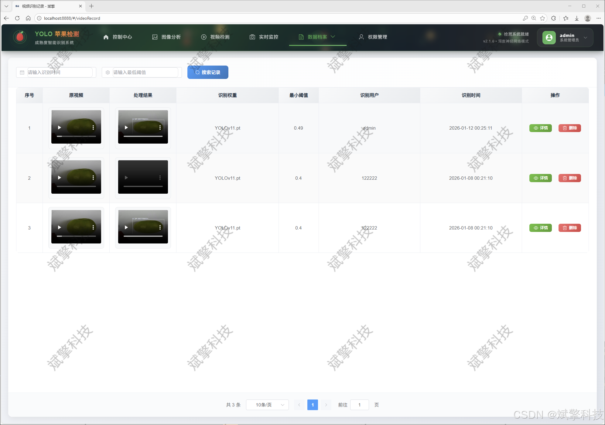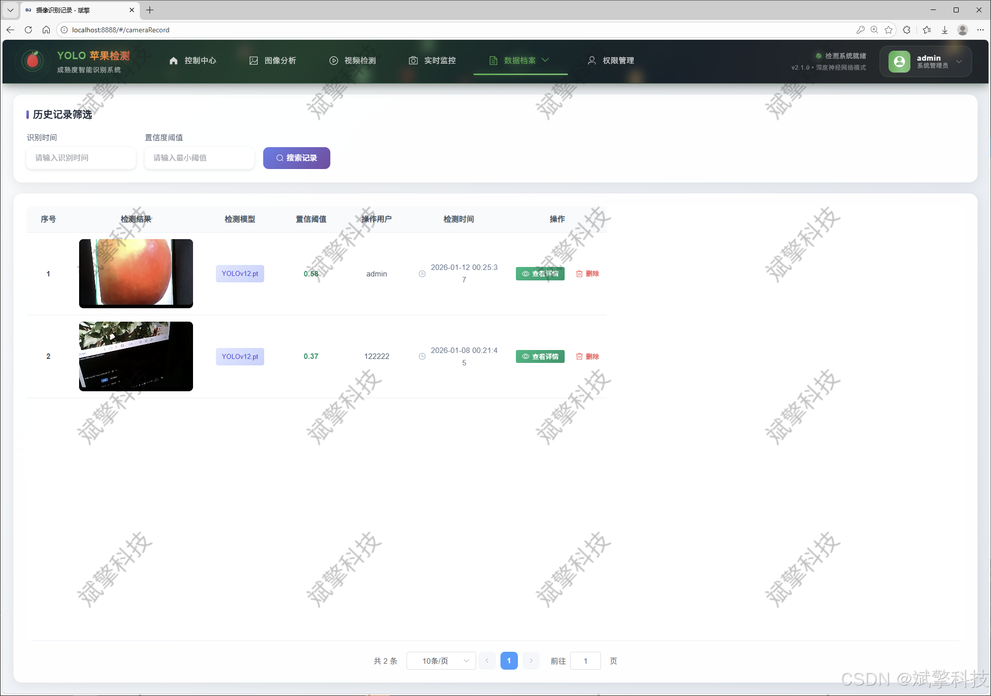 为实现技术的工程化落地与便捷交互,本系统采用前后端分离的SpringBoot + Vue.js架构,构建了功能完备的Web交互平台。系统不仅支持图片、视频及摄像头的实时流媒体检测,还创新性地集成了DeepSeek智能分析模型,对检测结果进行语义化解读与报告生成,增强了系统的可解释性与实用性。所有检测记录、用户行为等关键数据均持久化存储于MySQL数据库中,并通过丰富的数据可视化图表进行动态展示,辅助用户进行决策分析。此外,系统配备了完整的用户权限管理体系,包括用户注册登录、个人中心管理及后台管理员操控模块,确保了系统的安全性与可维护性。实验结果表明,本系统能够有效识别不同成熟阶段的苹果,为果园管理、自动化采摘及水果质量监控提供了可靠的技术解决方案,具有较高的实际应用价值。