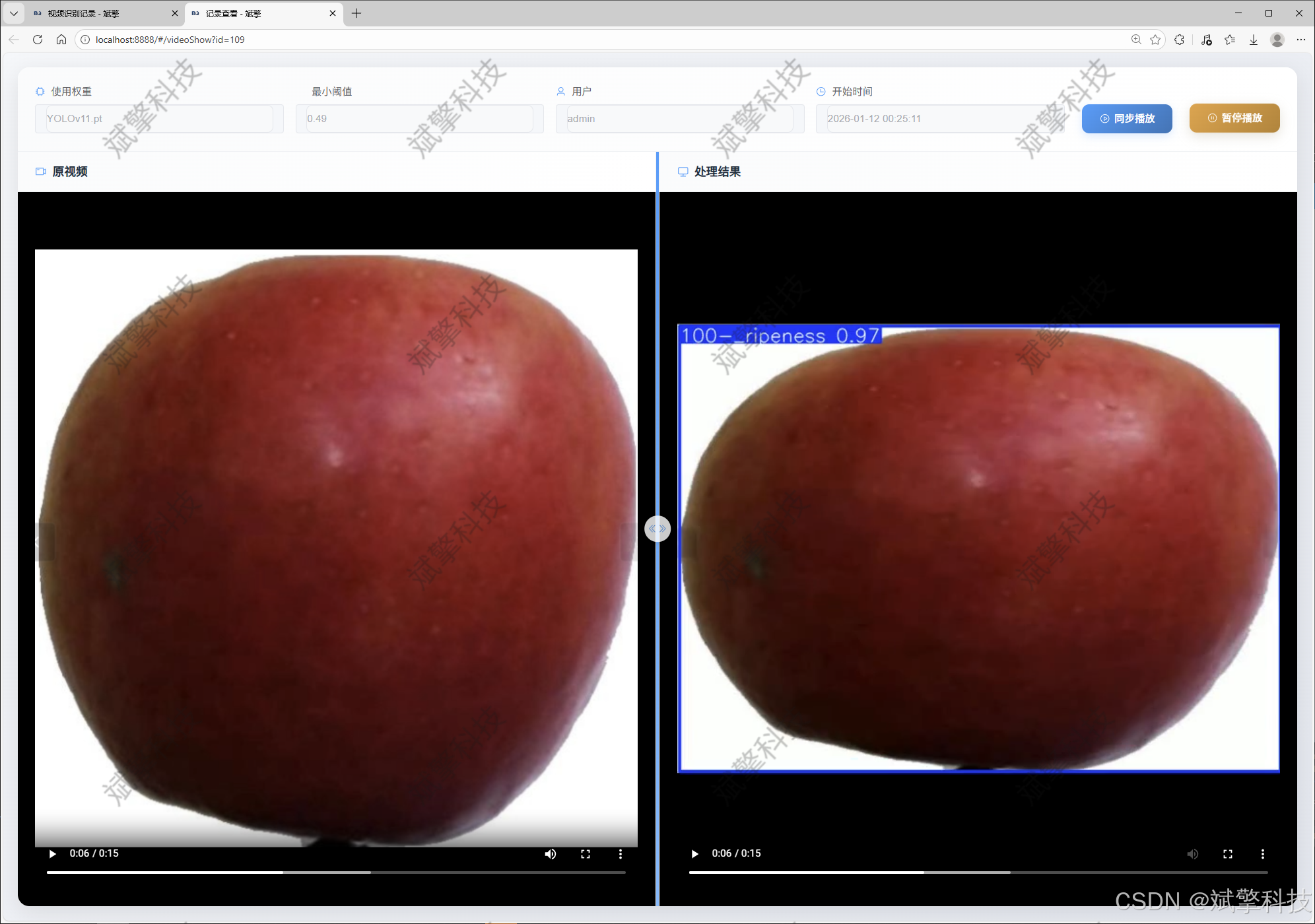 近年来,深度学习技术在计算机视觉领域取得了革命性突破,其中目标检测算法在农业视觉任务中展现出巨大潜力。YOLO系列算法以其卓越的检测速度和良好的精度,成为实时视觉应用的优选。与此同时,Web应用开发技术的成熟使得将复杂的AI模型封装为易于使用的在线服务成为可能。因此,构建一个结合前沿YOLO模型与现代化Web框架的苹果成熟度检测系统,不仅能够推动人工智能在农业领域的深度融合,也为实现果园智能化管理、构建农产品追溯体系提供了坚实的技术基础,对于促进农业现代化转型具有重要的理论意义与实践价值。