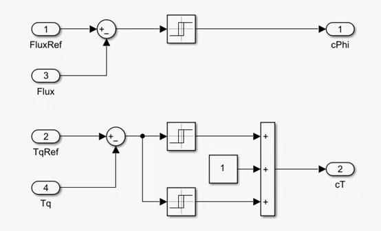 滞环比较器则用于比较磁通和转矩的给定值与估算值的偏差,并输出逻辑信号,决定选择哪个电压矢量。例如转矩滞环比较器代码: