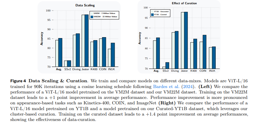 图 4(左)对比了基于 VM22M 预训练的 ViT-L/16 模型,与基于巴尔德斯等人(2024)提出的 200 万个视频的 VideoMix2M 数据集训练的同规格模型性能。结果显示,基于 VM22M 训练的模型,在视觉理解任务上的平均性能提升 1 个百分点,且在 Kinetics-400、COIN、ImageNet 等基于外观的任务上提升更为显著,证明提升视觉覆盖度对这类任务的重要性。