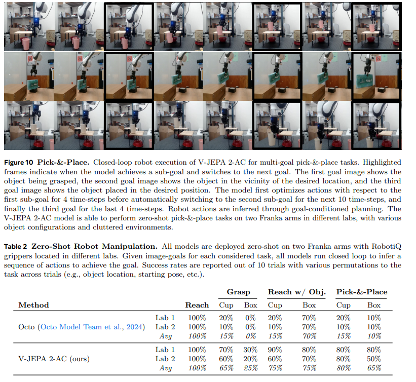 通过优化这两项损失的总和,V-JEPA 2-AC 减少了滚动预测过程中的误差累积,提升了未来状态预测的准确性。