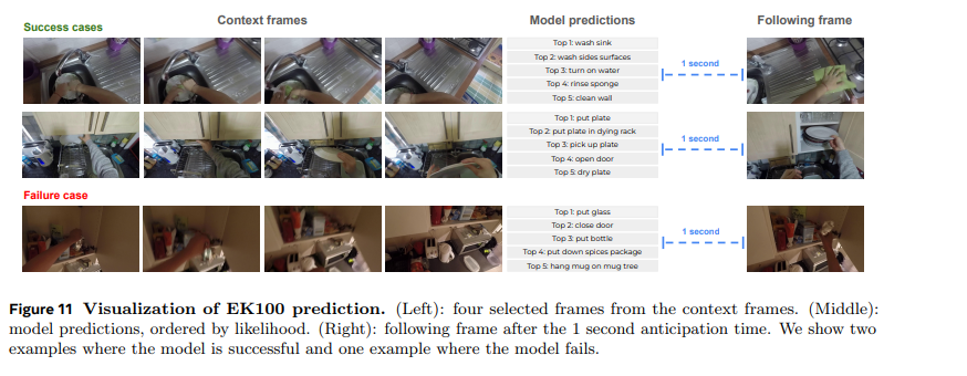 图 11 可视化了 V-JEPA 2 在 EK100 验证集三个样本上的预测结果,包括两个成功案例和一个失败案例。在两个成功案例中,V-JEPA 2 不仅能以最高置信度准确预测正确动作,还能基于给定上下文提出合理的 Top 2 至 Top 5 动作。例如,第一行的正确动作为 “清洗水槽”,但考虑到场景中存在水龙头和墙壁,“打开水龙头” 或 “清洁墙壁” 也是合理动作;模型还预测了 “冲洗海绵” 这一当前正在进行的动作,可能认为该动作在 1 秒后仍会继续。在失败案例中,V-JEPA 2 仍提出了 “关上门”“放下香料包” 等合理动作,但未能准确识别物体类型(实际为 “茶叶包”)。