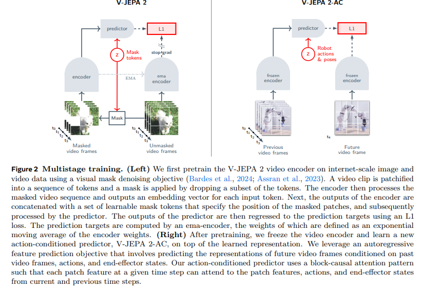 本文提出的 V-JEPA 2 采用分阶段训练流程:先在互联网规模的视频数据上进行无动作依赖的预训练,再利用少量交互数据进行后训练(见图 1)。第一阶段采用掩码去噪特征预测目标(阿斯拉恩等,2023;巴尔德斯等,2024),让模型在学习到的表征空间中预测视频的掩码片段。研究训练的 V-JEPA 2 编码器参数规模最高达 10 亿,训练数据包含超 100 万小时的视频。实验证实,规模化的自监督视频预训练能提升编码器的视觉理解能力,包括通用的运动和外观识别能力,这一点在基于探针的评估中,以及将编码器与语言模型对齐完成视频问答任务的实验中均得到验证(克罗耶尔等,2024;帕特劳钱等,2023;刘等,2024c;蔡等,2024;上官等,2024)。