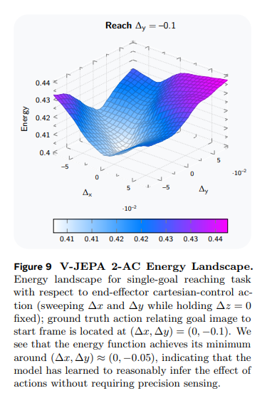 图 9 可视化了Δy到达任务中,V-JEPA 2-AC 的能量 landscape(基于式 (5)):固定Δz=0,遍历Δx和Δy的取值,分析单笛卡尔控制动作对能量的影响。结果显示,能量函数在真实动作附近达到最小值,进一步证明模型无需精确传感即可合理推断动作的效果;同时观察到 V-JEPA 2-AC 诱导的能量 landscape 相对平滑且局部凸,这一特性有助于提升规划效率。