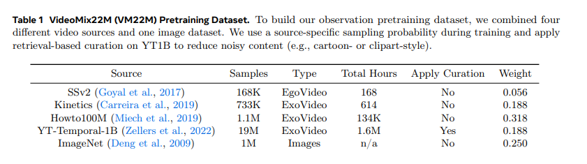 研究通过整合公开可用的数据源,构建了大规模视频数据集,采用公开数据源也便于其他研究者复现实验结果。该数据集包含:Something-Something v2 的第一视角视频(戈亚尔等人,2017)、Kinetics 400/600/700 的第三人称动作视频(凯伊等人,2017;卡雷拉等人,2018、2019)、HowTo100M 的 YouTube 教程视频(米什等人,2019)、YT-Temporal-1B 的通用 YouTube 视频(泽勒斯等人,2022,简称 YT1B);同时加入 ImageNet 的图像数据(邓等人,2009),以提升预训练数据的视觉覆盖度。