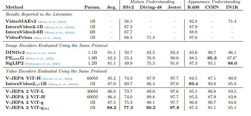 研究将 V-JEPA 2 在运动和外观任务上的性能,与多个其他视觉编码器进行对比:DINOv2(达塞等人,2024)是当前自监督图像学习的最先进模型;SigLIP2(岑嫩等人,2025)和感知编码器PEcoreG(博利亚等人,2025)是图像 - 文本对比预训练的最先进模型;同时还纳入了两个视频编码器 —— 自监督的 V-JEPA(巴尔德斯等人,2024),以及主要依赖视觉 - 文本对比预训练的 InternVideo2s2-1B(王等人,2024b)。