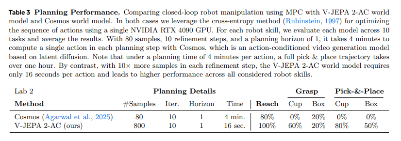 表 3 对比了 V-JEPA 2-AC 与基于潜在扩散的 Cosmos 动作条件视频生成模型的规划性能:两者均采用交叉熵方法(鲁宾斯坦,1997)在单块 NVIDIA RTX 4090 GPU 上优化动作序列,能量函数通过在模型的潜在空间中编码目标帧构建(如式 (5) 所示)。Cosmos 模型在每个规划步骤中,采用 80 个样本、10 次优化迭代、规划时域为 1,单次动作计算需 4 分钟;尽管其在到达任务中取得 80% 的高成功率,但在物体交互任务中的表现较弱 —— 按此计算,完成一次完整的拾取 - 放置轨迹需超过 1 小时的机器人执行时间。相比之下,V-JEPA 2-AC 世界模型在每个优化步骤中使用 10 倍于 Cosmos 的样本量,单次动作计算仅需 16 秒,且在所有测试的机器人技能中均表现更优。未来可通过以下方式进一步缩短两种模型的规划时间:利用更多计算资源支持规划过程、减少每个时间步的样本量和优化迭代次数、在世界模型的模拟空间中训练前馈策略以初始化规划问题,或针对 V-JEPA 2-AC 探索基于梯度的规划方法。